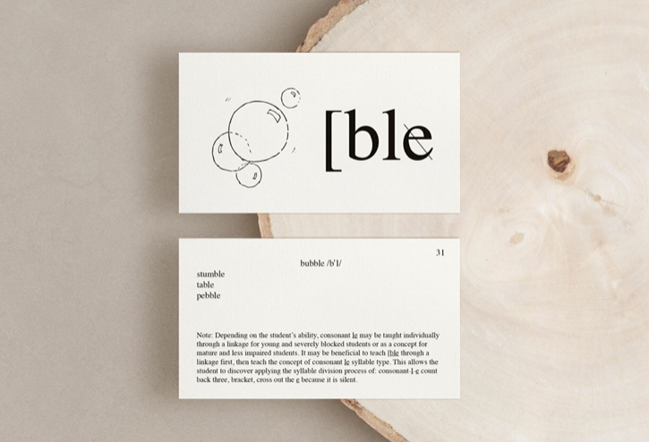 The FSS Deck is a 3x5 printed on cover stock that includes the naming card (i.e. ARD with no picture) and the keyword and sound card (i.e. IRD) for the following: ----ble, cle, dle, fle, gle, kle, ple, tle, ckle, zle, stle, tion, sion, sion voiced, tious, cial, cious, cian, dure, and ture.